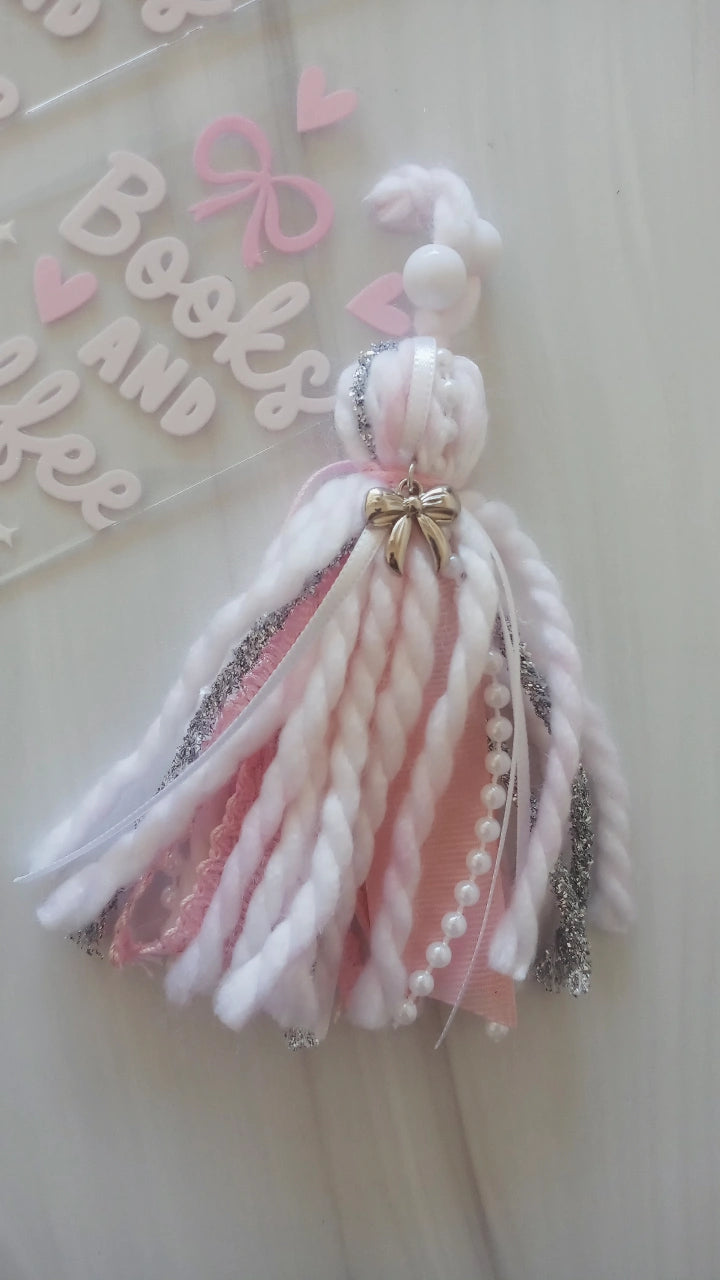 Cute tassel full of pink yarn with ribbons, pearls and a silver bow charm.