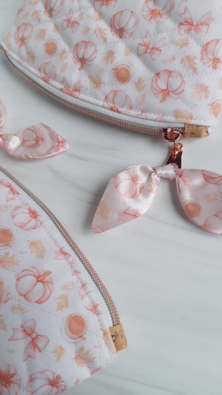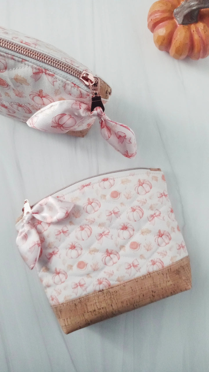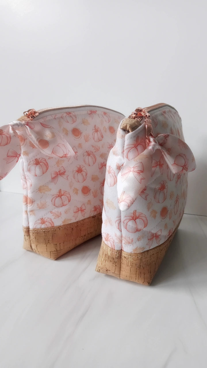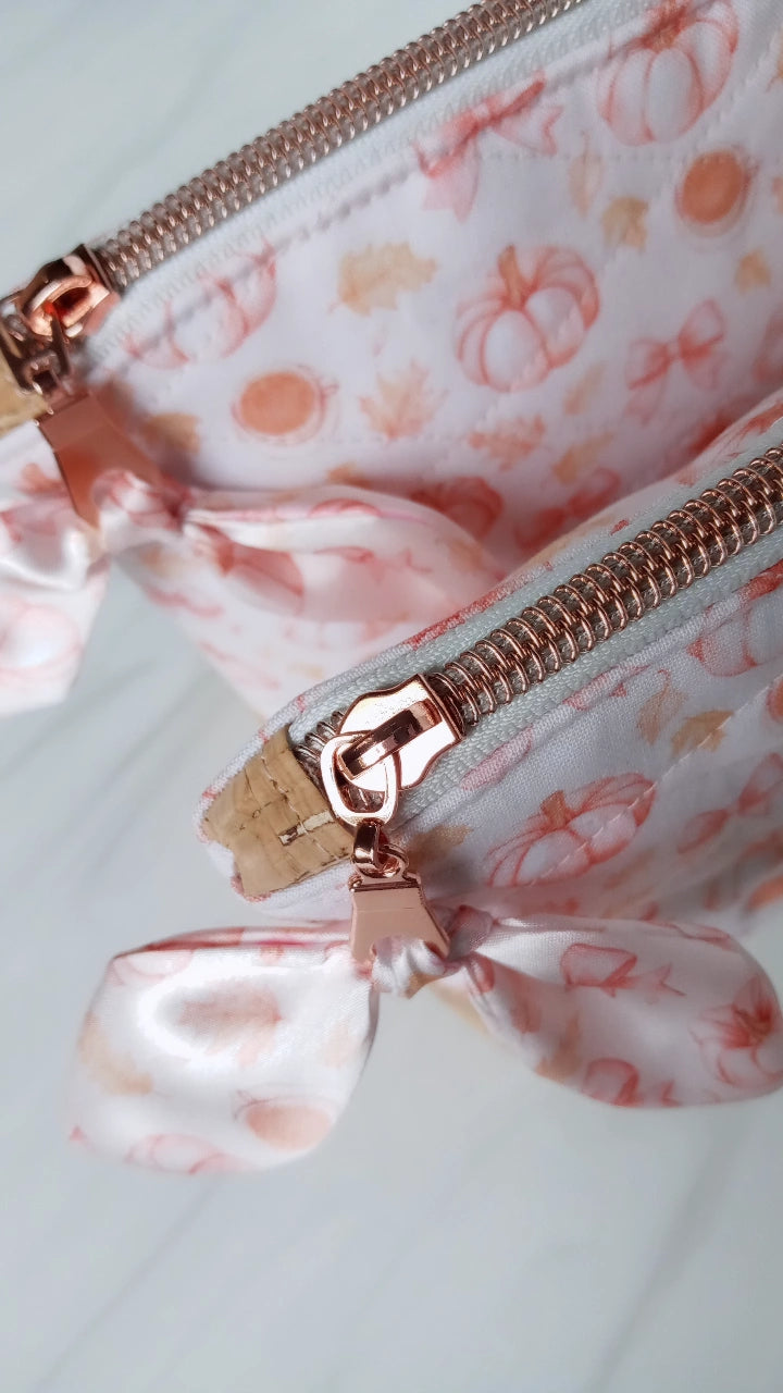 A beautiful Fall custom printed cotton quilted bag with cute style. A cork leather base that wipes away moisture easily. Rose gold tone zipper with a tied satin petal bow.