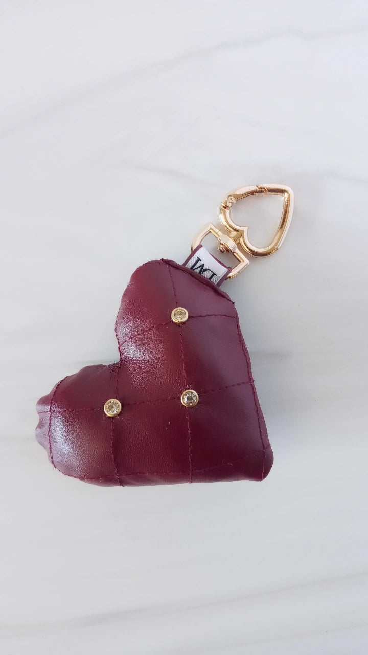 The studded heart charm is a bag must have! Quilted with studs and a 360 spin clasp, the heart charm looks perfect on tote bags, book bags or even your keys.