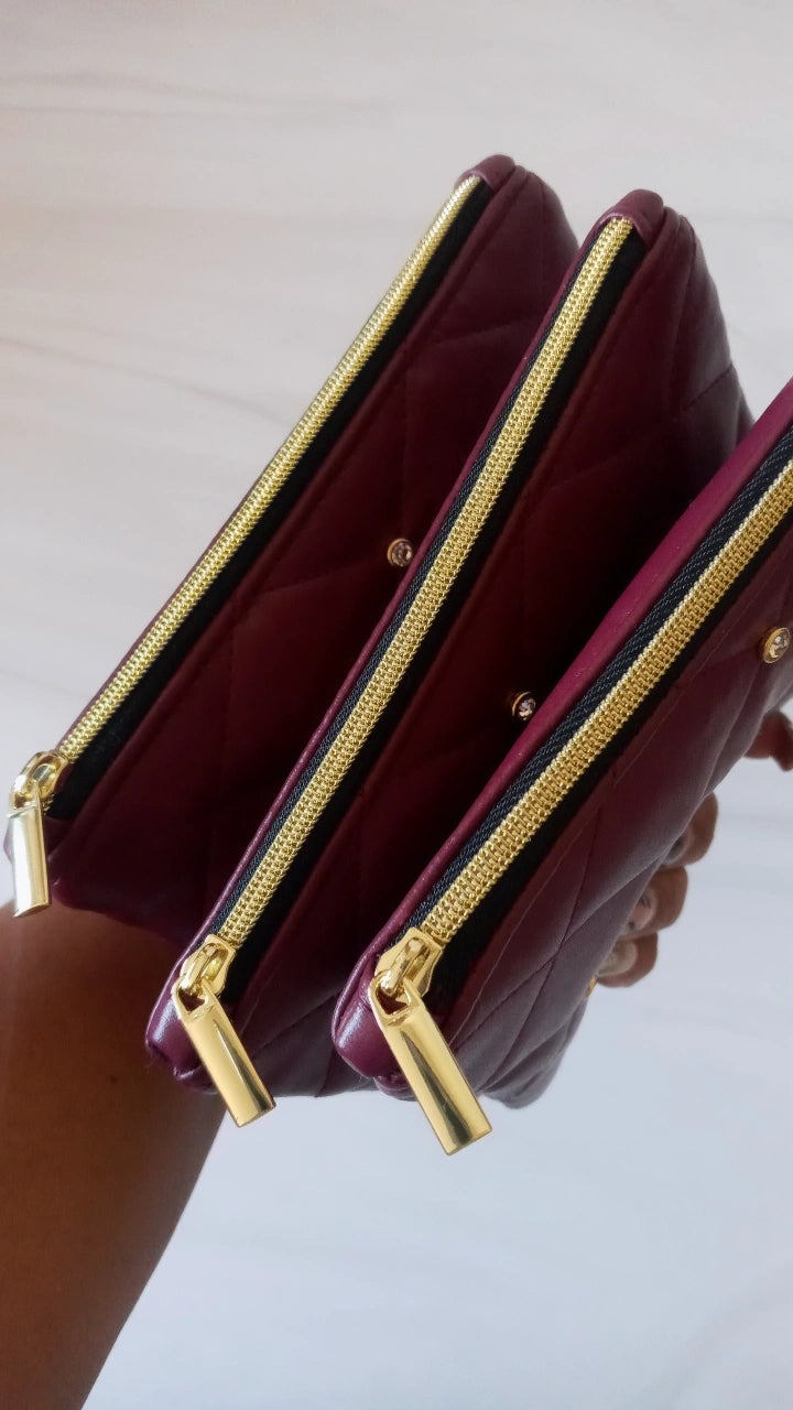 The oversized studded wallet comes quilted on the front with beautiful rhinestone studs. Gold tone zipper and a half moon pocket on the reverse for extra store.